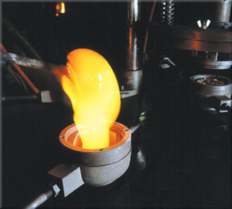 Heated in the furnace, the clear or full-colour raw material melts and turns into a viscous fluid.