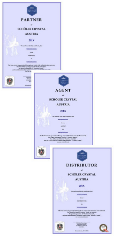 Lighting and gift companies with whom we work closely together and who represent our brand SCHÖLER CRYSTAL® can receive a partner certificate on request.
